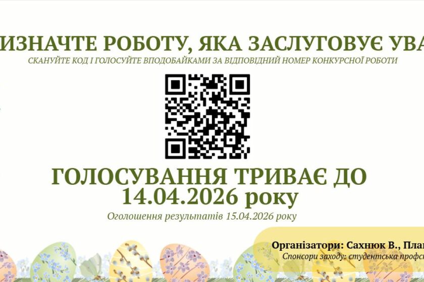 Голосуємо за найкращу конкурсну роботу “Великодня писанка” до 14.04.2026 року. Переглядаємо конкурсні роботи Обираємо варіант роботи і віддаємо свій голос за посиланням https://xoyondo.com/ap/aysipqocq6vmsba або QR-кодом. Керівники проєкту
