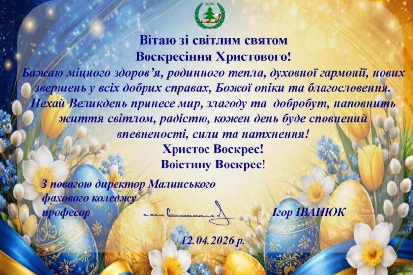 Вітання директора Малинського фахового коледжу з Великоднем.
