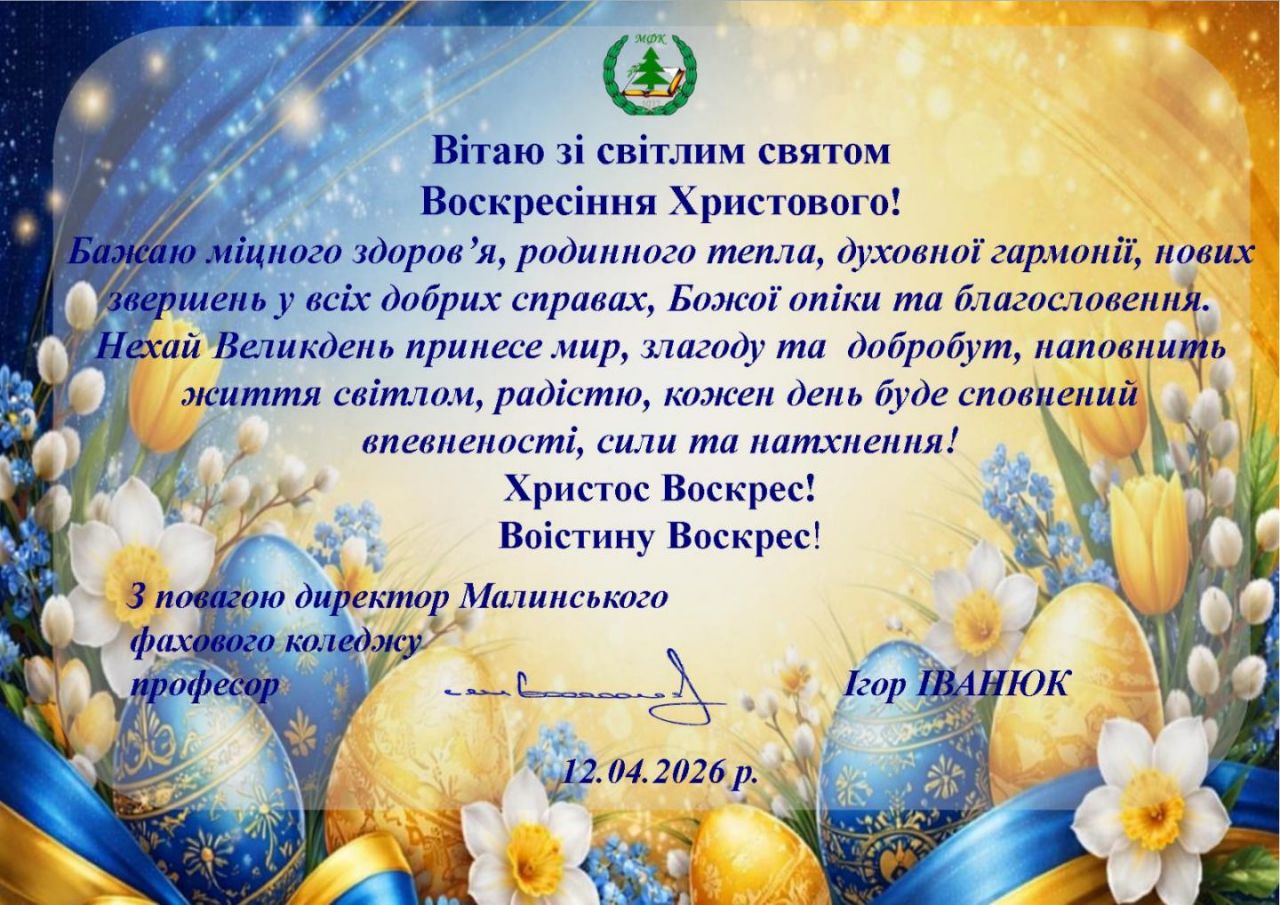 Вітання директора Малинського фахового коледжу з Великоднем.