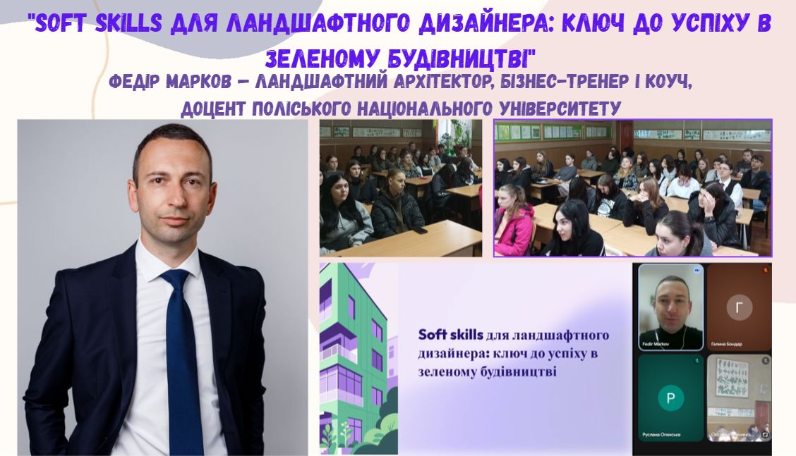 Під час лекції обговорили важливість комунікації, креативного мислення, вміння працювати в команді та презентувати свої ідеї. Саме ці навички допомагають фахівцю реалізовувати проекти, будувати довіру із замовниками та створювати сучасні, екологічні простори.