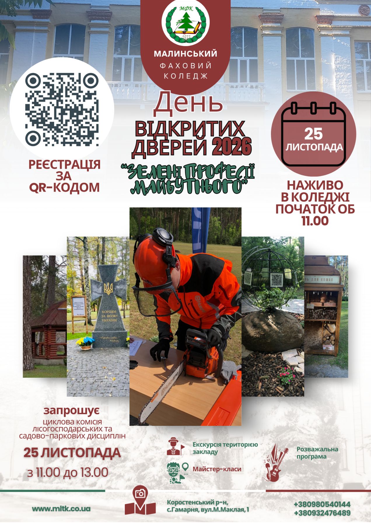 Запрошуємо всіх охочих на День відкритих дверей, який відбудеться 25 листопада з 11.00 до 13.00 під гаслом “Зелені професії майбутнього”. 🌱