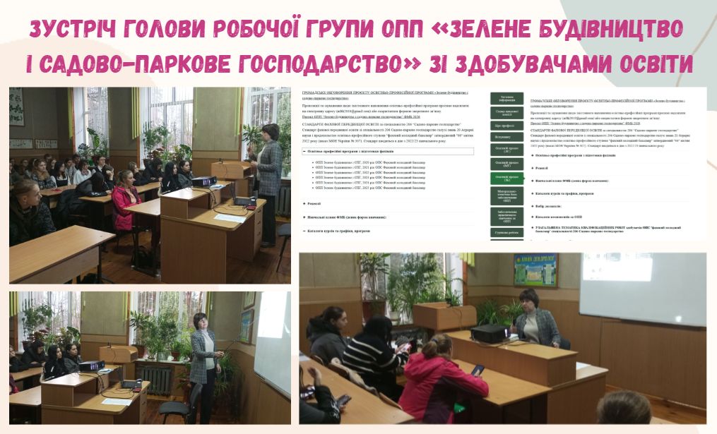 Відбулася зустріч голови робочої групи ОПП «Зелене будівництво і садово-паркове господарство» Таїси ГАНЖАЛЮК зі здобувачами освіти другого та третього курсу спеціальності 206 «Садово-паркове господарство». Мета співпраці – отримати зворотній зв’язок від здобувачів освіти щодо правил та принципів академічної доброчесності на всіх етапах навчання; особливостей освітнього процесу з ОПП «Зелене будівництво і садово-паркове господарство» (проведення дослідницької роботи, участь у науково-практичних конференціях; виробниче навчання; можливість вибору дисциплін). На зустрічі наголошено на важливості думки та ініціативи саме здобувачів щодо налагодження продуктивного освітнього процесу. Проведення дієвого діалогу зі здобувачами є одним із шляхів удосконалення освітньо-професійної програми.