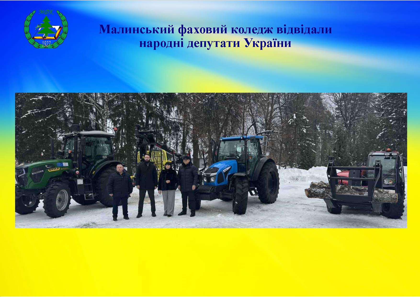 Колектив Малинського фахового коледжу щиро дякує народним депутатам України Богдану Кицаку та Тетяні Грищенко за увагу до розвитку фахової перед вищої освіти, підтримку коледжу, сприяння у реалізації важливих освітніх ініціатив та практичну допомогу. Така співпраця є надзвичайно цінною для розвитку закладу й створення сучасних умов навчання для студентів.