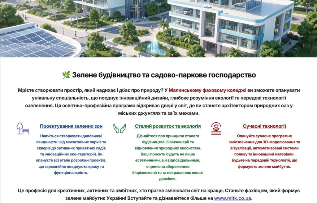 Ландшафтний дизайн – це розробка та впровадження заходів щодо перетворення та оформлення земельної ділянки. Наразі існує безліч рішень облаштування території як присадибної так і загального користування земельної ділянки. Зведення альпійських гірок, оформлення газонів і клумб, організація освітлення та поливу, включення малих архітектурних форм (скульптур, альтанок, містків, гойдалок), штучних водоймищ та багато іншого – все це комплекс робіт які виконує – фаховий молодший бакалавр з садово-паркового господарства. Від того, наскільки професійно розроблений та впроваджений проєкт ландшафтного дизайну, залежить чи буде на даній ділянці затишно й комфортно.