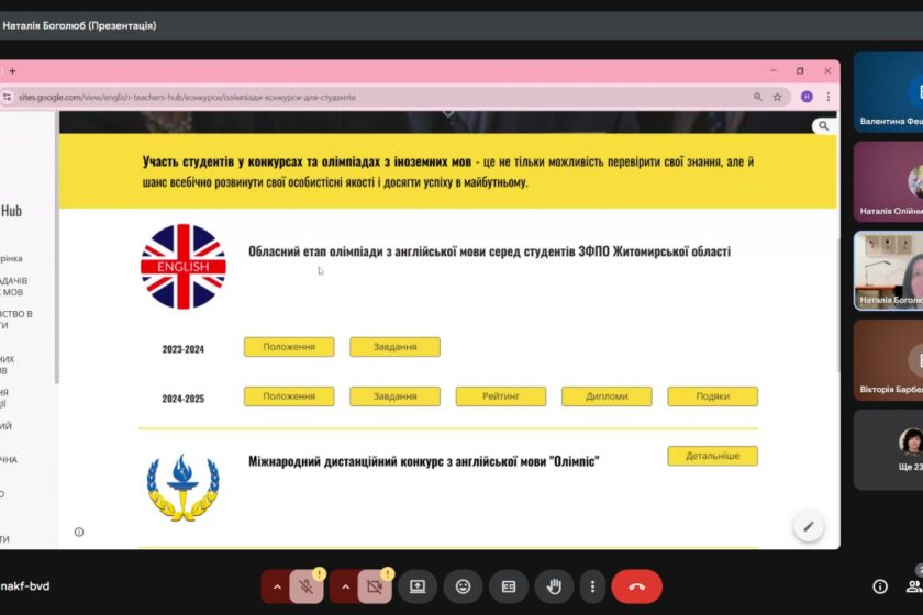 19 листопада 2025 року викладачі іноземних мов Малинського фахового коледжу долучились у дистанційному форматі до обласного методичного об’єднання, що було проведено на базі Бердичівського фахового коледжу промисловості, економіки та права; Відокремленого структурного підрозділу «Житомирський торговельно-економічний фаховий коледж Державного торговельно-економічного університету» та Відокремленого структурного підрозділу «Фаховий коледж будівництва, архітектури та дизайну Поліського національного університету».