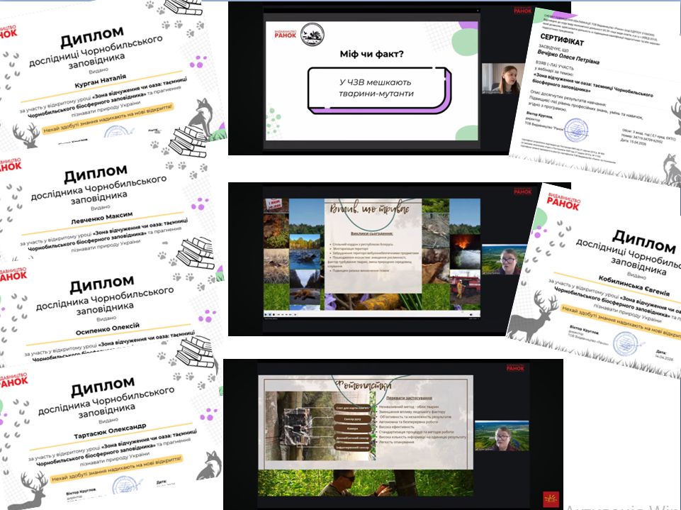 14 квітня здобувачі освіти спеціальності «Лісове господарство» разом із викладачем екології Олесею Вечірко долучилися до змістовної онлайн-зустрічі на тему: «Зона відчуження чи оаза: таємниці Чорнобильського біосферного заповідника». Захід було організовано командою видавництва «Ранок» у співпраці з Чорнобильським біосферним заповідником та приурочено до 40-х роковин Чорнобильської катастрофи.
