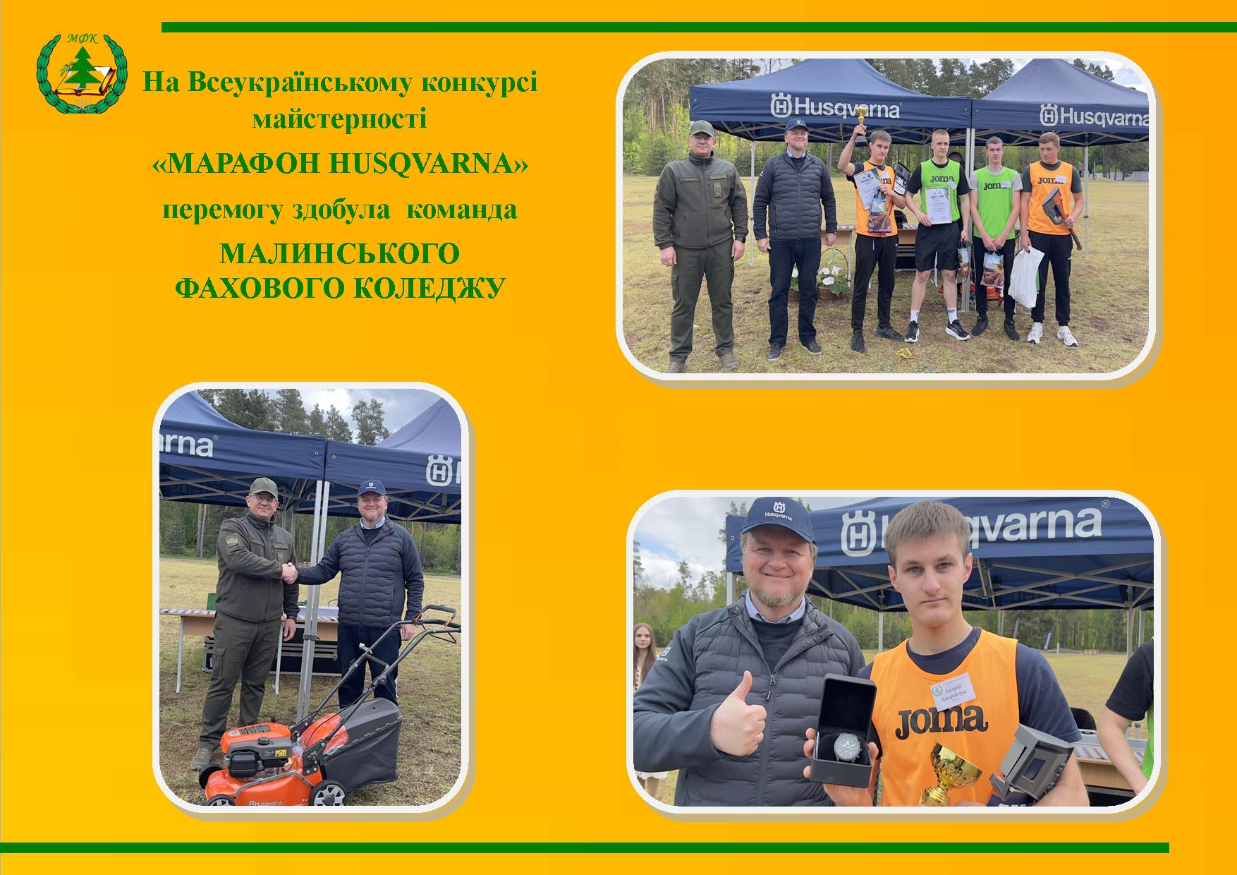 На Всеукраїнському конкурсі майстерності «МАРАФОН HUSQVARNA», серед команд 8 освітніх закладів фахової перед вищої освіти команда Малинського фахового коледжу здобула перемогу, а в особистому заліку найкращим був визнаний студент нашого коледжу Андрійчук Андрій.