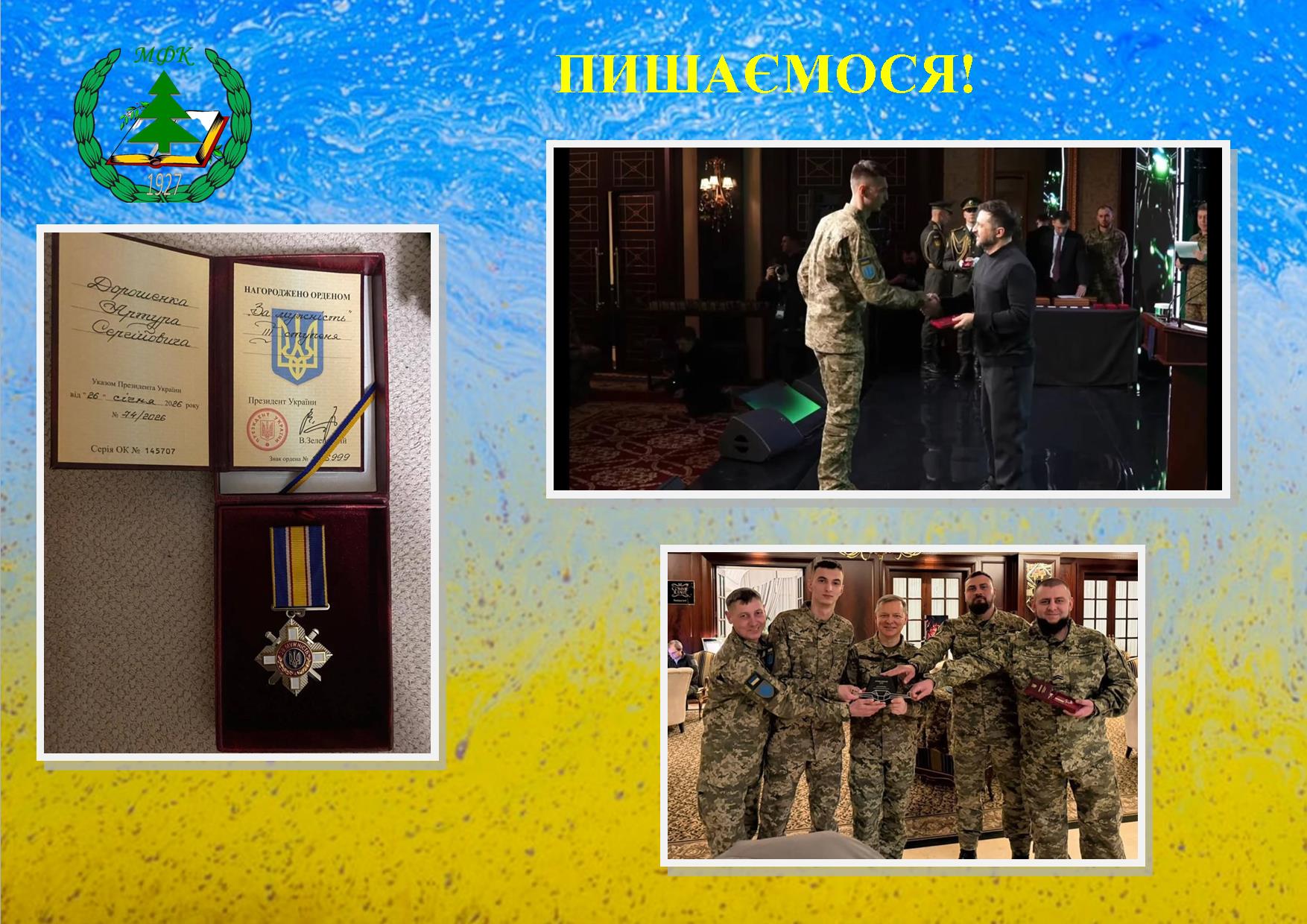 Президент України Володимир Зеленський вручив орден «За мужність» ІІІ ступеня Дорошенку Артуру Сергійовичу — студенту Малинського фахового коледжу, заочної форми навчання за спеціальністю 205 «Лісове господарство» (освітній ступінь «бакалавр»), військовослужбовцю Збройних Сил України.