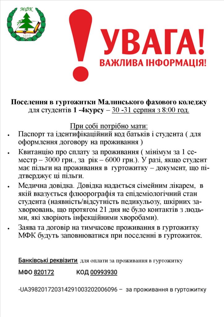 Важлива інформація стосовно поселення в гуртожитку Малинського фахового коледжу.