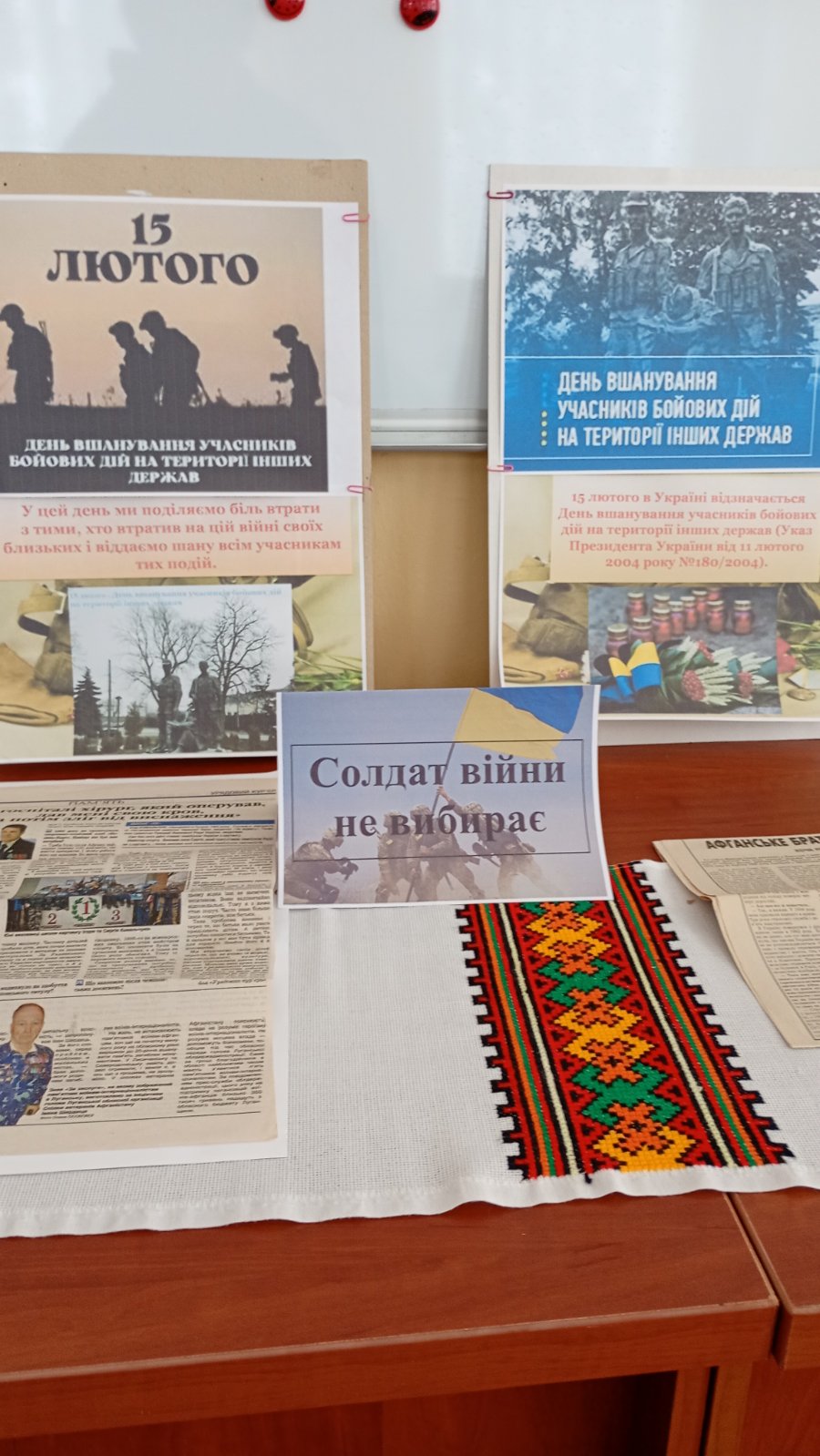15 лютого – День вшанування учасників бойових дій на території інших держав. В цей день ми вшановуємо тих, хто пройшов горнило радянсько-афганської війни та інших локальних війн і збройних конфліктів на територіях 16 іноземних держав. Найбільш масштабною та трагічною була війна в Республіці Афганістан, яка тривала довгих 10 років. В роки Афганської війни воїнами-інтернаціоналістами називали радянських військовослужбовців у Афганістані. Через горнило радянсько-афганської війни пройшло понад 160 тисяч українців. З них 2 378 загинули… Ми пам`ятаємо…