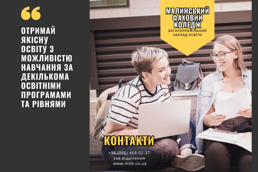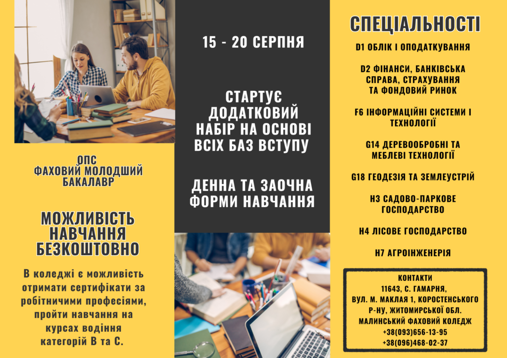 📣 Увага, абітурієнти! Із 15 по 20 серпня триває додатковий набір до Малинського фахового коледжу випускників 9 та 11 класів. Не втрать свій шанс отримати якісну освіту та перспективну професію! Обирай сучасні спеціальності, навчання у комфортних умовах і дружню атмосферу. Наші викладачі допоможуть тобі впевнено крокувати до майбутнього. Поспішай подати документи — твоя успішна кар’єра починається тут! Детальніше переглянь інформацію на фото.