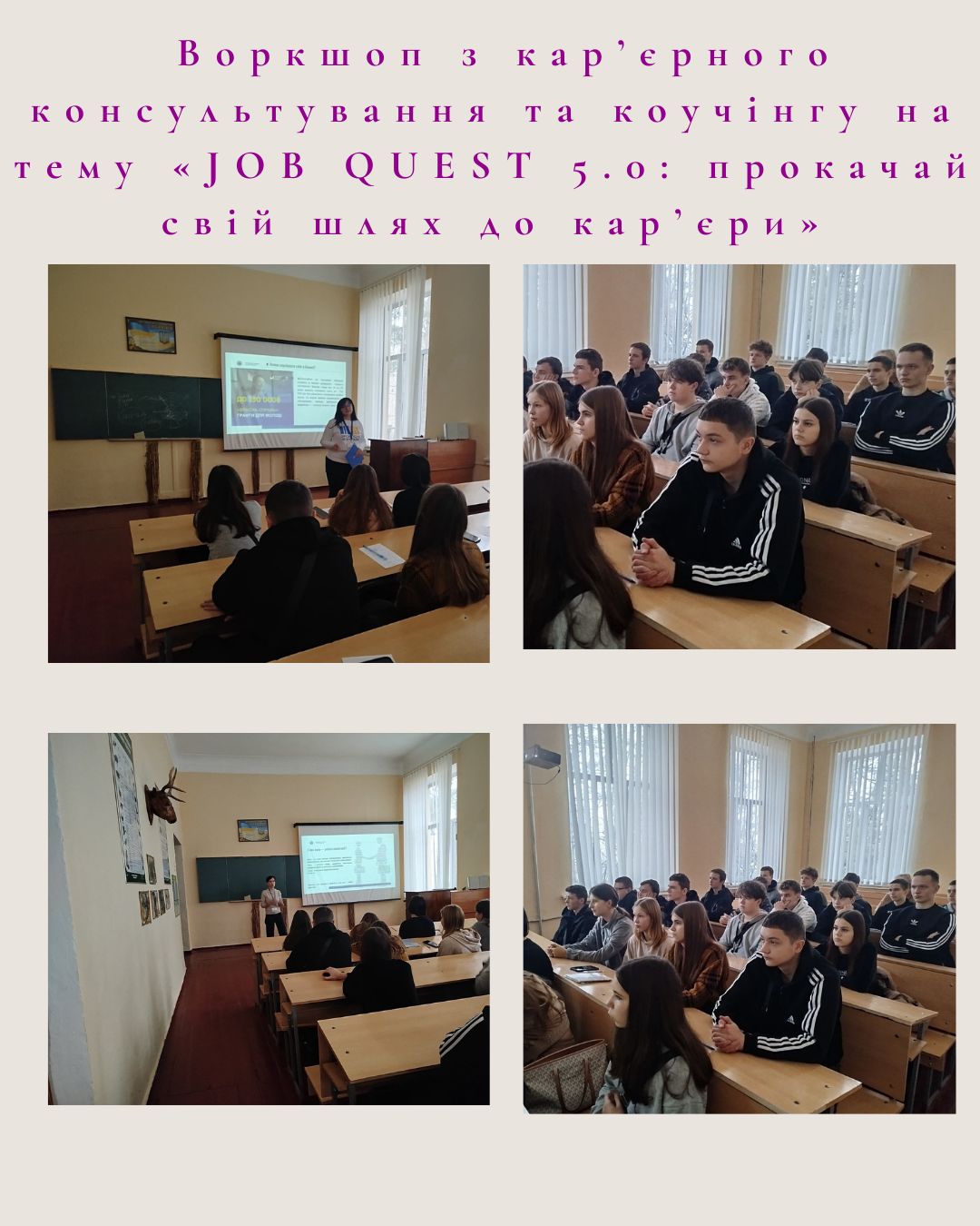 11 листопада Ганна Кучинська – психолог, кар’єрна консультантка Житомирського обласного центру зайнятості та Левченко Наталія – експертка з отримання грантів Малинського управління Коростенської філії ЖОЦЗ провели воркшоп з кар’єрного консультування та коучінгу на тему «JOB QUEST 5.0: прокачай свій шлях до кар’єри» для групи ІСТ 11 спеціальності
