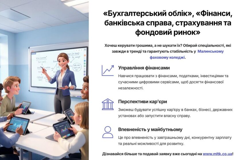 Хочеш керувати грошима, а не шукати їх? Обирай спеціальності, які завжди в тренді та гарантують стабільність у Малинському фаховому коледжі. Тут ти навчишся працювати з фінансами, податками, інвестиціями та сучасними цифровими сервісами. Зможеш будувати кар’єру в банках, бізнесі, державних установах або запустити власну справу. Це про впевненість у завтрашньому дні, конкурентну зарплату та реальні можливості розвитку. Дізнавайся більше та подавай заявку вже сьогодні на www.mltk.co.ua у розділі “Вступникам” за телефонами приймальної комісії!