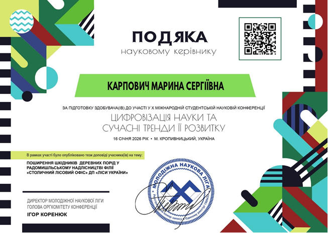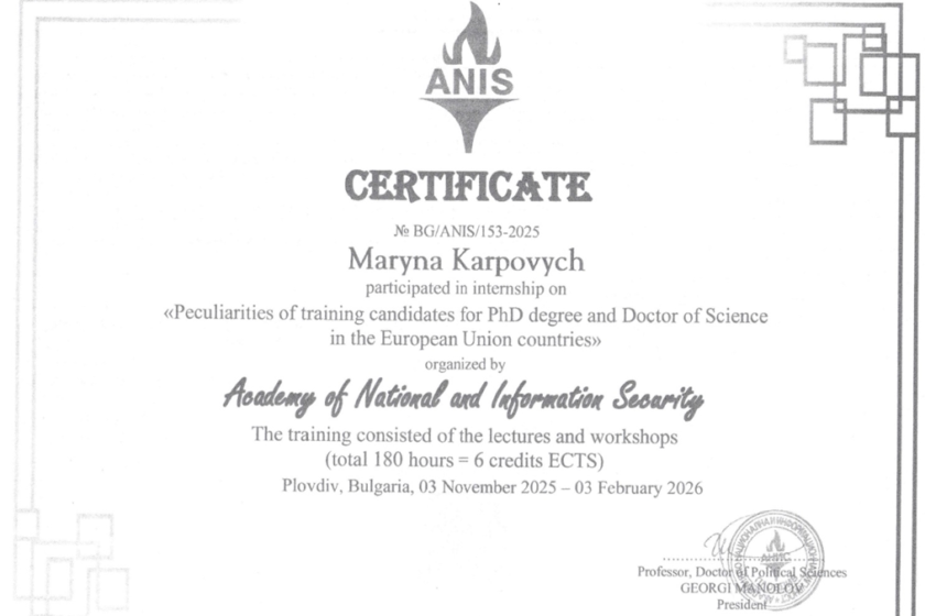 З 03 грудня по 03 лютого 2026 року викладач Марина Карпович проходила онлайн-стажування в місті Пловдів (Болгарія) при Академії національної та інформаційної безпеки на тему: «Особливості підготовки здобувачів наукового ступеня […]